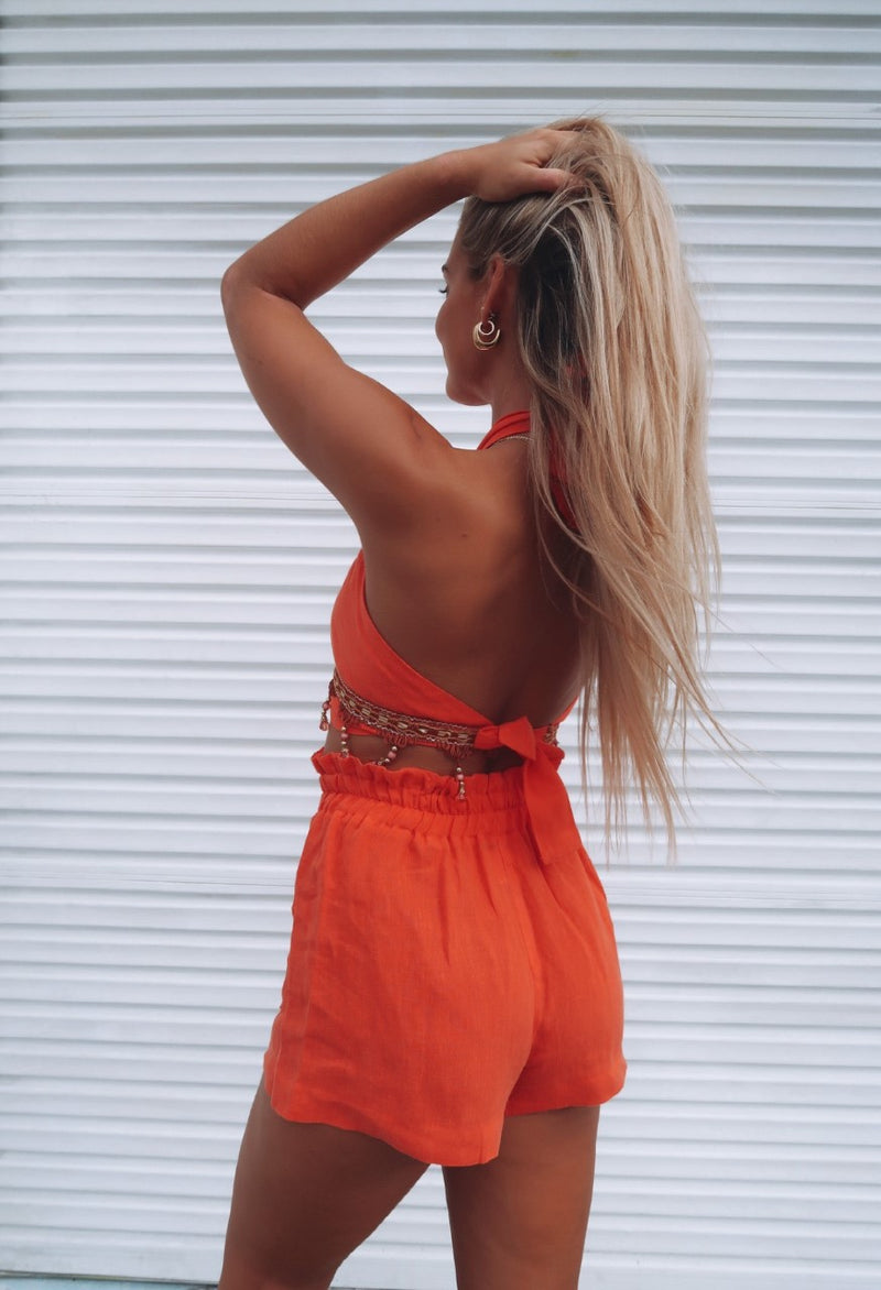 Made from a high quality, crisp pure linen, the La Contessa Halter features a cross over front with a soft tie at the back of the neck. This style is held in place with the under bust band, and ties at the back. We love the open back detail on this gorgeous top!