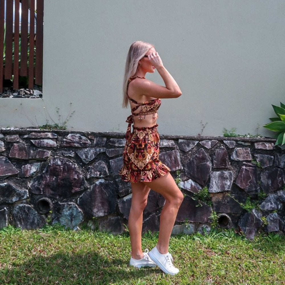 Straps are a nice comfortable width with a slight vintage feel. These cross over at the back, pass through top loops, cross over and pass through the bottom loops, and tie neatly into a bow at the back. Very snug, comfortable fit. Finished with woven band of bronze and gold thread, with triple combinations of gold and transparent heart shaped beads. Perfect with the matching skirt or paired with one of your favourite pieces, it'll fast become one of your go to crops.