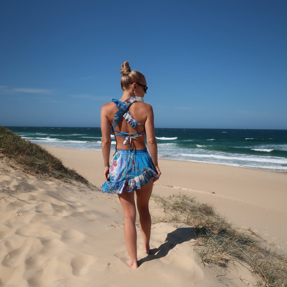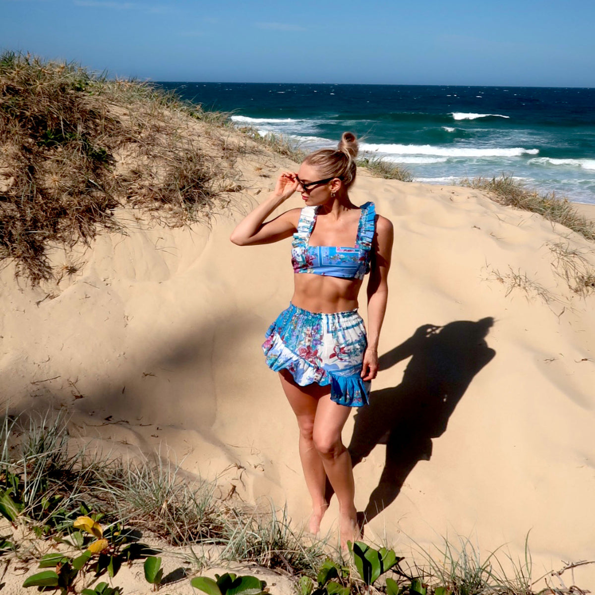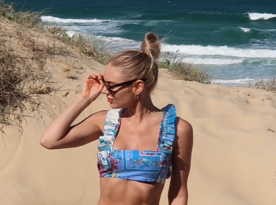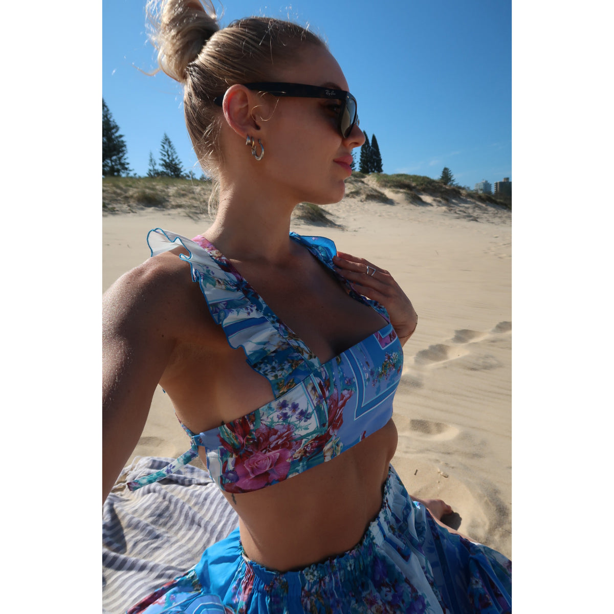 Soft shoulder strap frills, are finely edge stitched with aqua. Double, cross-over tie back, guarantees a snug fit. The crop is lined for added comfort.